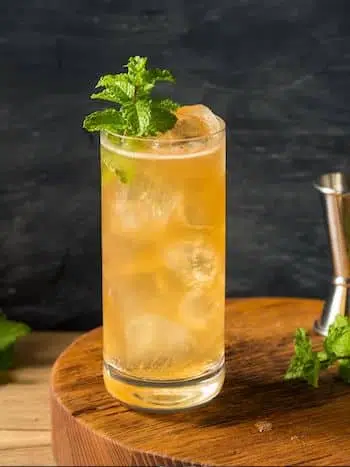 Mit Gingerbeer auffüllen, mit Minze garnieren und servieren.